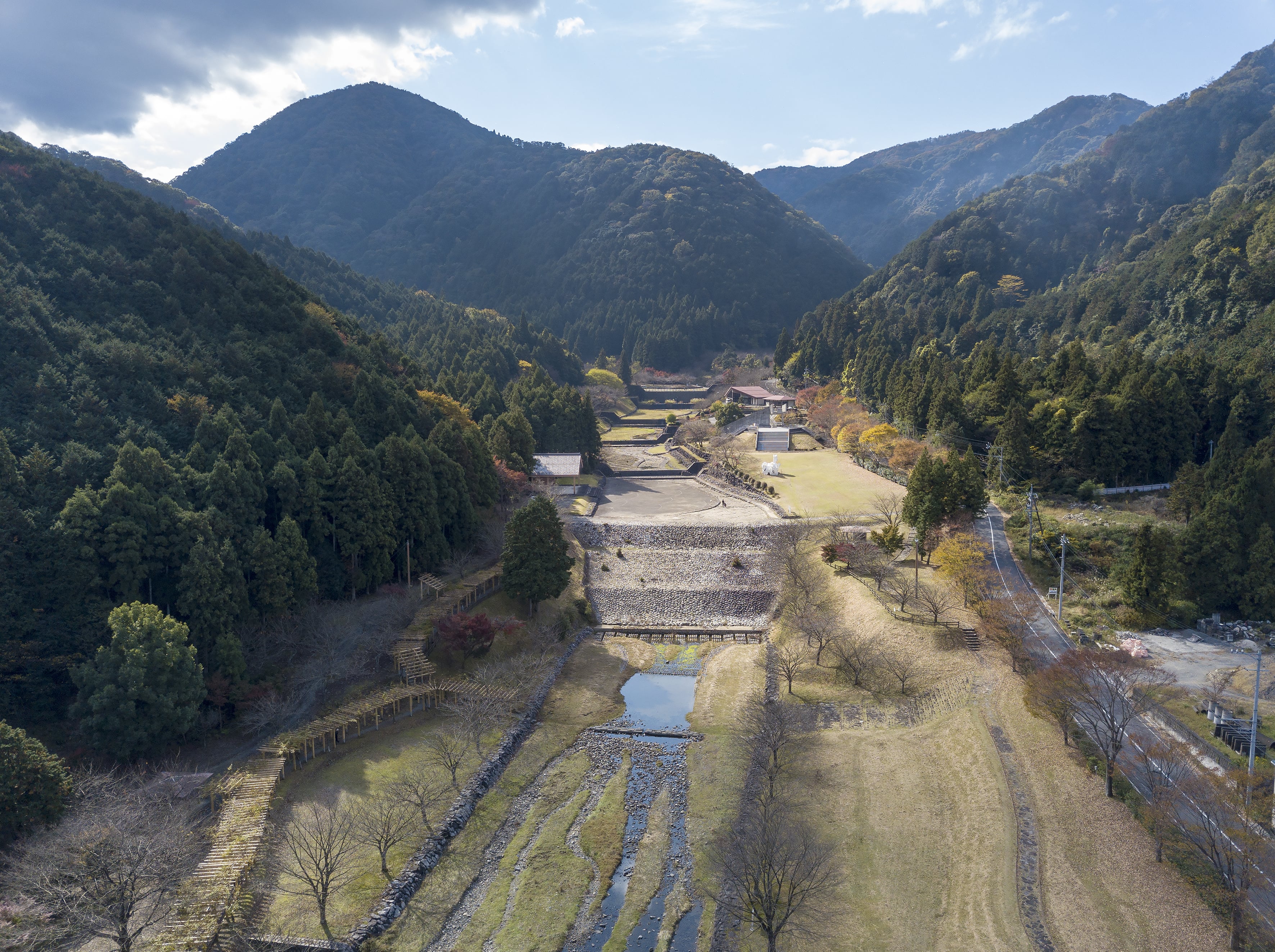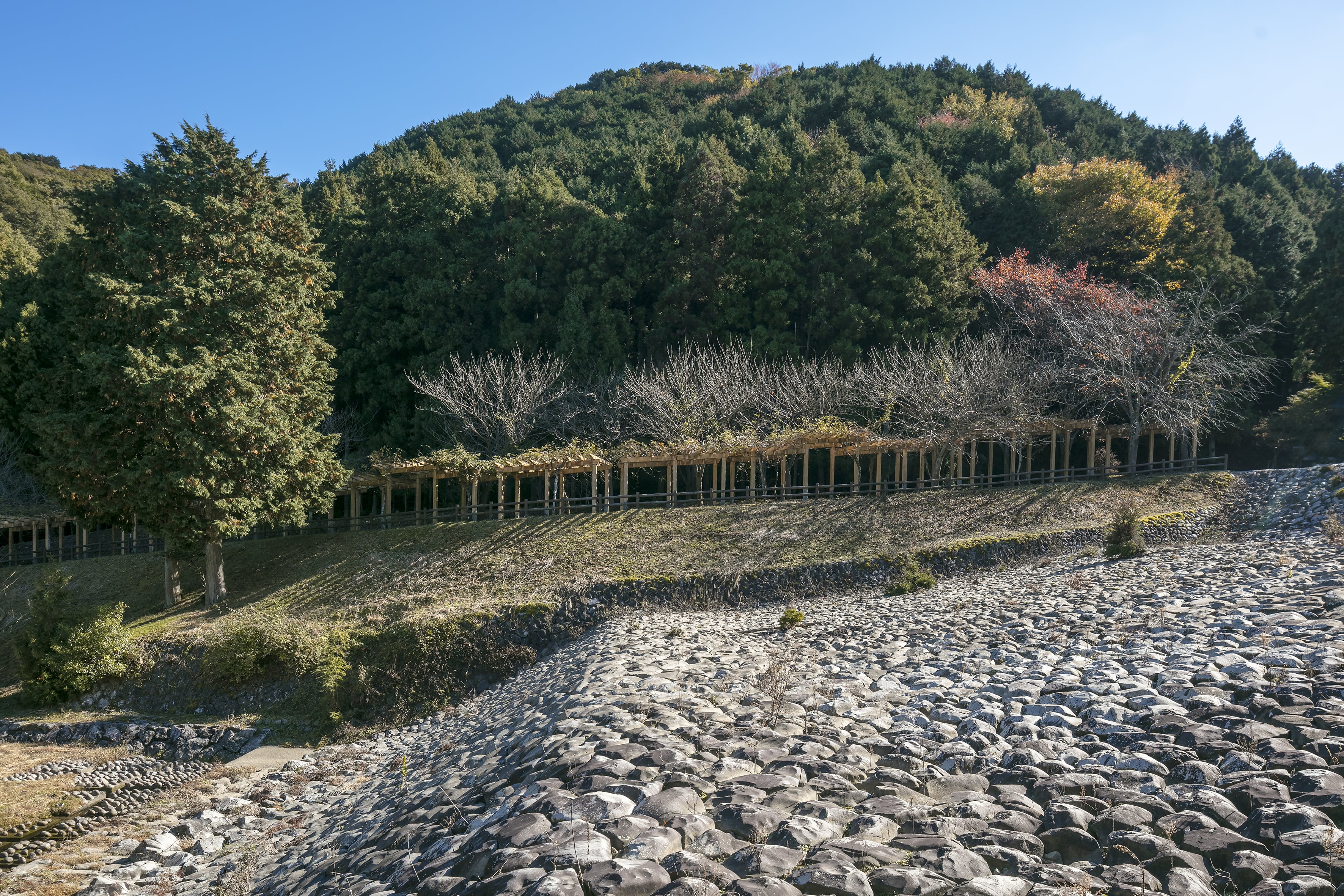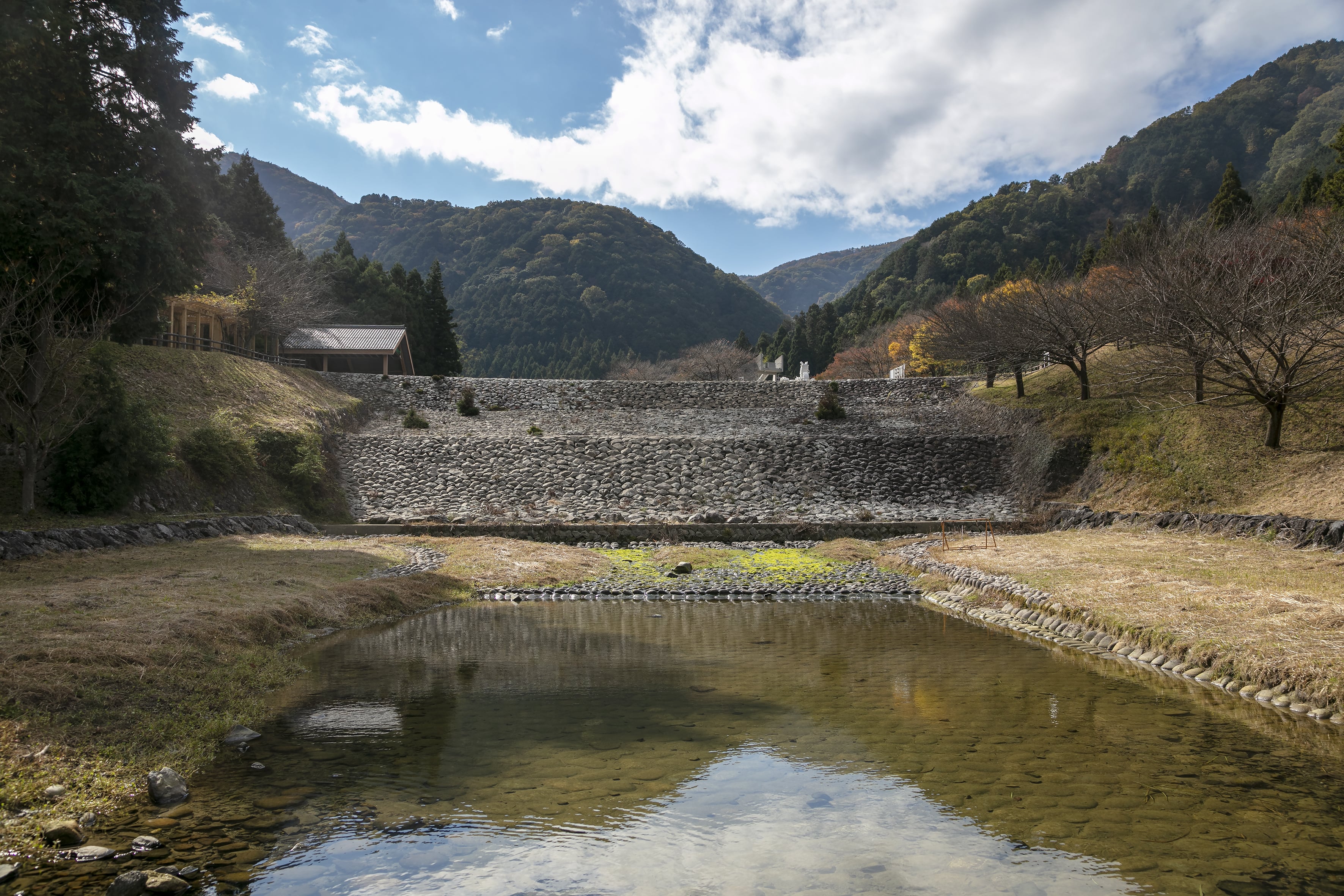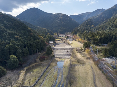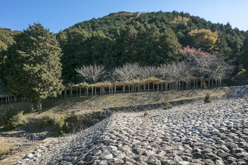 The Holland dam in Kaizu was built under the supervision of Johannis de Rijke to control erosion along a river valley. The dam features large stone structures that serve as an effective barrier to prevent soil erosion and protect agricultural land. It is one of two dams in Kaizu constructed by De Rijke — and both continue to serve the region’s flood control efforts today.